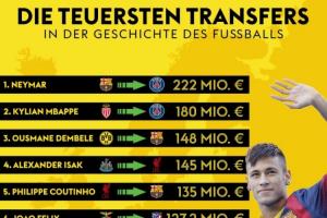 💰足坛历史最贵转会:内马尔2.2亿欧居首,伊萨克第4&维尔茨第8