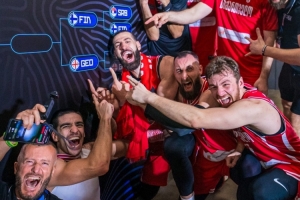 这是格鲁吉亚男篮历史首次打进欧锦赛八强。赛后的格鲁吉亚众将在晋级墙前兴奋合影。