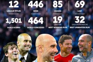 瓜迪奥拉执教生涯600场联赛纪录↓