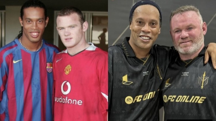 有网友晒出了鲁尼和小罗在2005年为足球游戏FIFA 06拍摄广告时的合影作为对比,显然时光在两人的身上都留下足够的痕迹。