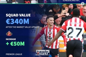 各大联赛身价涨/跌最多队:桑德兰、科莫大幅上涨,曼城-2千万