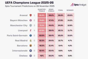 欧冠夺冠概率:阿森纳超23%遥遥领先,拜仁曼城红军巴黎皇马2-6位