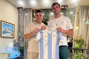 记者Victor Navarro在社媒晒出了和大马丁一同手持一件大马丁亲笔签名的球衣照片,并配文写道:“The Dibu(大马丁的绰号)。他现在还在巴塞罗那,在La cupula del Garraf餐厅见到了他。”