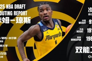 卡姆-琼斯是来自马奎特大学的大龄即战力后卫,技术成熟度高,对挡拆的运用与终结的创造力能达到NBA层级,但运动能力是他的最大短板。进入NBA后,球队可能需要在防守端把他“藏一藏”,避免其频繁遭遇挡拆或换防的场景,会比较适配中锋蹲坑的五外体系,可以充当打10-15分钟的替补持球手角色,但23岁的年纪基本上没有太多的改造空间,手握次轮签的球队完全可以将其视作板凳奇兵押上一注。